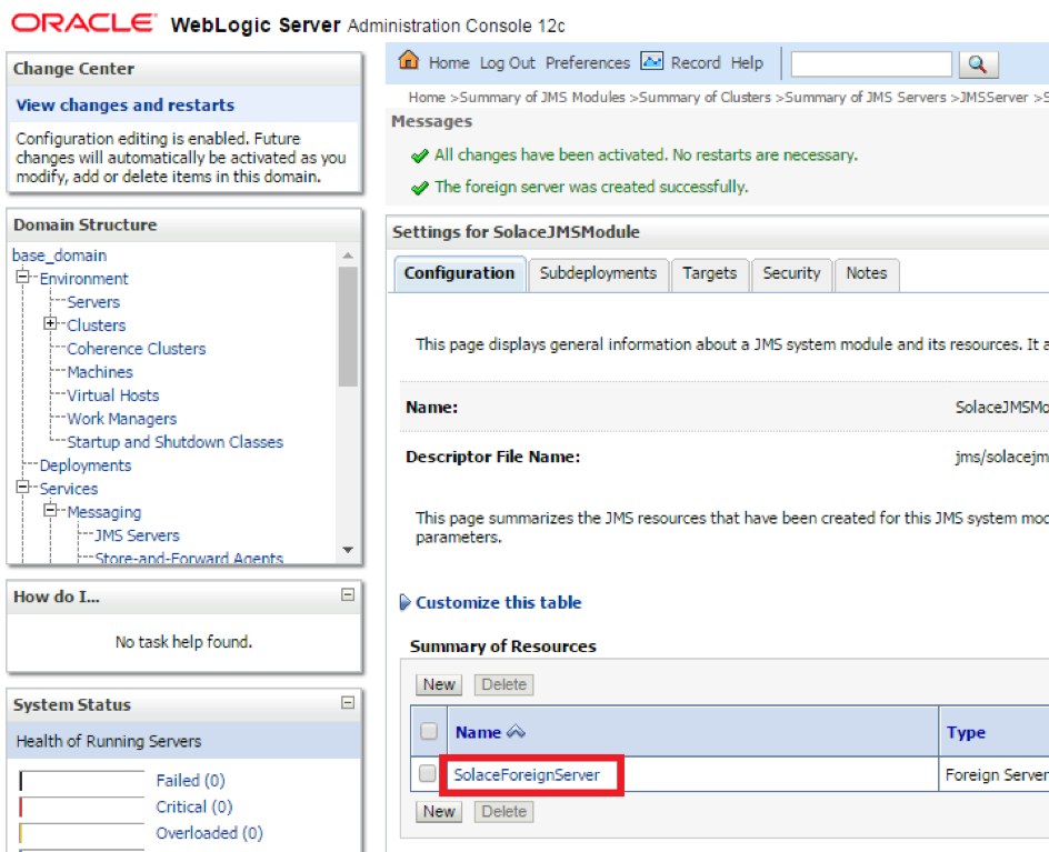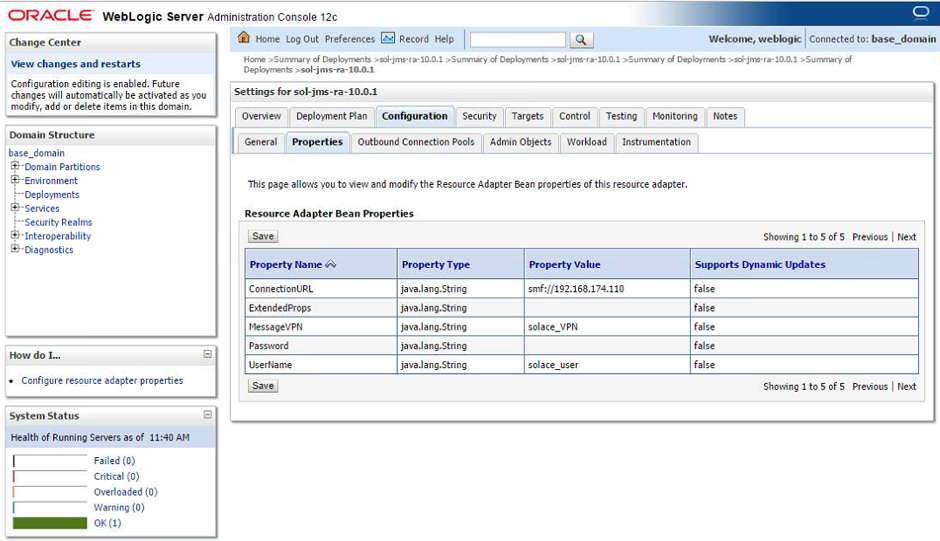 Solace provides a JCA compliant resource adapter for integrating Java enterprise applications with the Solace JMS event broker. There are two options for integrating Solace with WebLogic for use by Java enterprise applications including embedded and stand-alone deployment. This section will cover instructions on configuring the Resource Adapter Archive (RAR) file for stand-alone deployment, and configuring Solace as a Foreign JMS Provider